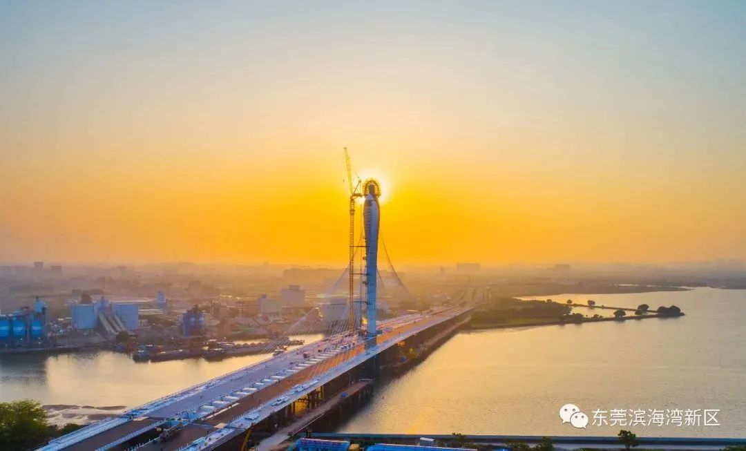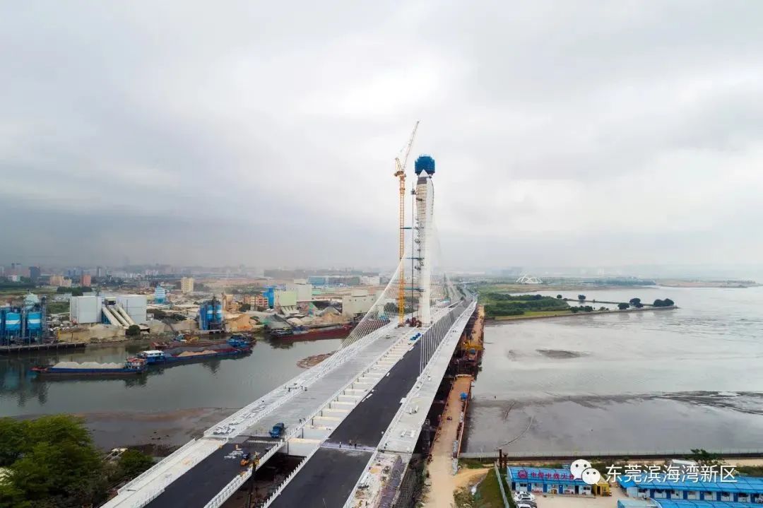 濱海灣大橋全長973.6米,道路紅線寬度為80米,主塔高149.8米,是國內(nèi)跨度較大、橋面較寬的獨塔扭索面斜拉橋,建成后,將成為東莞濱海灣新區(qū)的標(biāo)志性建筑。