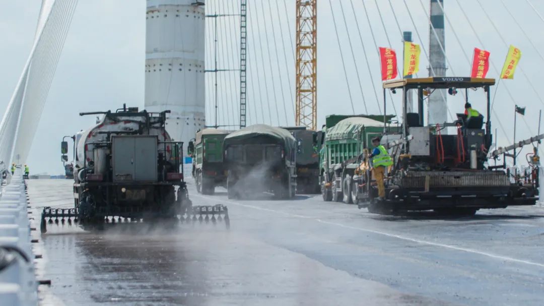 本次施工配備了灑布車、銑刨機及20臺瀝青混凝土自卸車。采用兩臺沃爾沃攤鋪機,雙攤鋪機聯(lián)合施工,配以三臺雙鋼輪震蕩式壓路機、兩臺膠輪壓路機、一臺小型鋼輪壓路機,六臺壓路機作業(yè)夯實瀝青路面。主橋瀝青面層使用的是SMA-13,全稱瀝青馬蹄脂碎石混合料,是瀝青結(jié)合料與少量纖維穩(wěn)定劑、細集料以及較多量的礦粉組成的瀝青瑪蹄脂,填充于間斷級配的粗集料骨架的間隙組成一體的瀝青混合料,用于鋪筑高性能瀝青路面。攤鋪設(shè)備、承載瀝青混合料的車輛、施工班子及技術(shù)人員提前集結(jié)完畢,快速開展攤鋪施工工作,降低施工時間,提高施工效率。